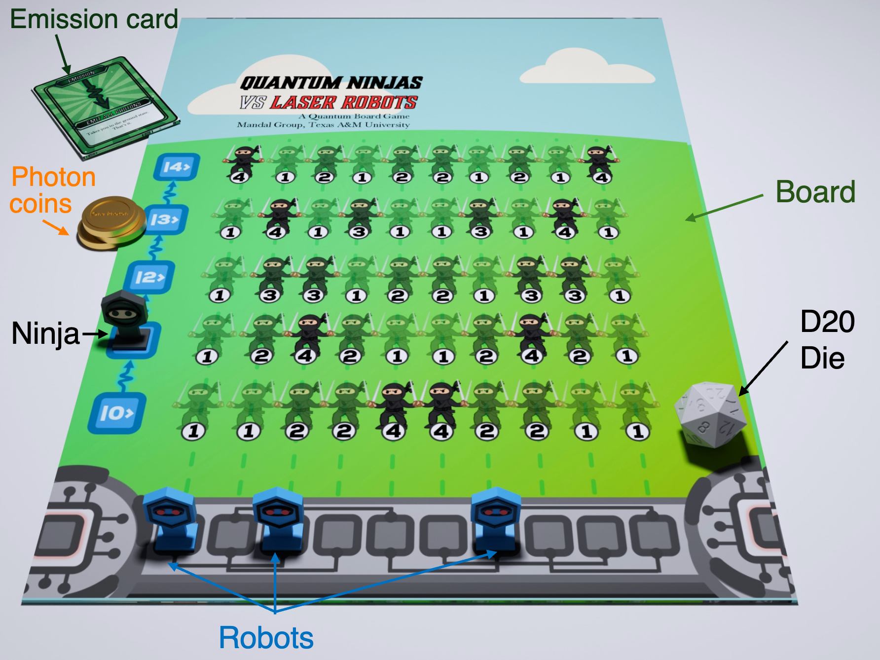 Our group has created a board game that plays by the rules of quantum mechanics. In Quantum Ninjas vs. Laser Robots, the ninjas disguise their whereabouts by spatially delocalizing (their wavefunction), while a stash of quantized photons lets them hop between states. The laser robot hunts them down by “observing”—rolling a die to collapse the wavefunction and (maybe!) catch a ninja, all in true quantum style.